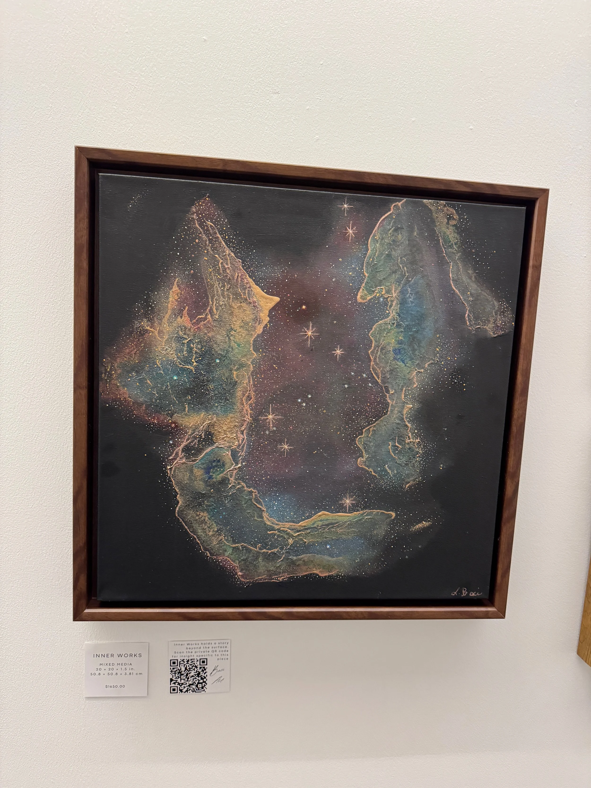 Following a journey to witness the 2023 solar eclipse, Lori experienced a profound sense of connection to something larger than herself. From that moment on, her work shifted exclusively toward painting the night sky. Using NASA imagery as a foundation, she creates pieces that speak to our origins, the human experience, and the universal connection we all share.